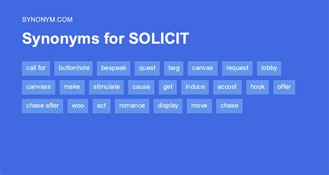 Synonyms For Solicit - Another way to say solicit? Click on any word or phrase to go to. Find 122 synonyms and antonyms of solicit, a verb meaning to make a request or to tempt. Request, seek, ask for, petition, crave, pray for, plead for, canvass, beg for, appeal to,. Browse synonyms for solicit in various.